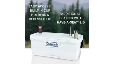 ¿Lleva la hielera a toda su capacidad? Disfrute de un levantamiento más fácil con las manijas laterales abatibles, luego siéntese en la tapa cerrada. No se preocupe, los portavasos integrados en la tapa mantendrán su bebida cerca y evitarán derrames.