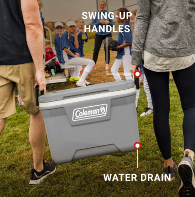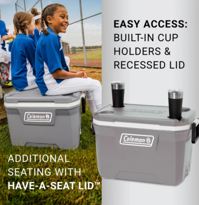 ¿Lleva una carga completa? Disfrute de un levantamiento más fácil con las manijas laterales abatibles, luego siéntese en la tapa cerrada. No se preocupe, los portavasos integrados en la tapa mantendrán su bebida cerca y evitarán derrames. Con espacio para acomodar hasta 80 latas, seguramente habrá muchos refrigerios para el juego de pelota de sus hijos, un día en la playa o una tarde en el parque.